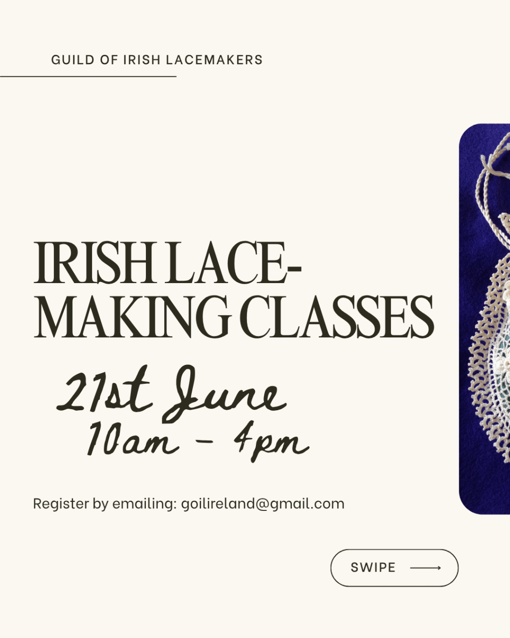 Join us for a spooooooky lace day on Saturday the 18th of October 2025. Classes: Irish crochet (Kathie Earle)Mountmellick (Marée Maher)Bobbin (Ann Keller)Carrickmacross (Mary Shields) There will also of course be the social table. Venue: Parish Pastoral CentreHoly Cross ChurchMain StDundrumD14 K820 The Pastoral Centre is located beside the Church. Time: Morning session: 10.30am-1pm (Registration